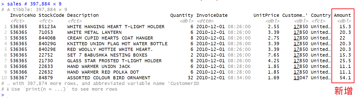 mutate(Amount=Quantity*UnitPrice) %>% # 新增 Amount=Quantity*UnitPrice
